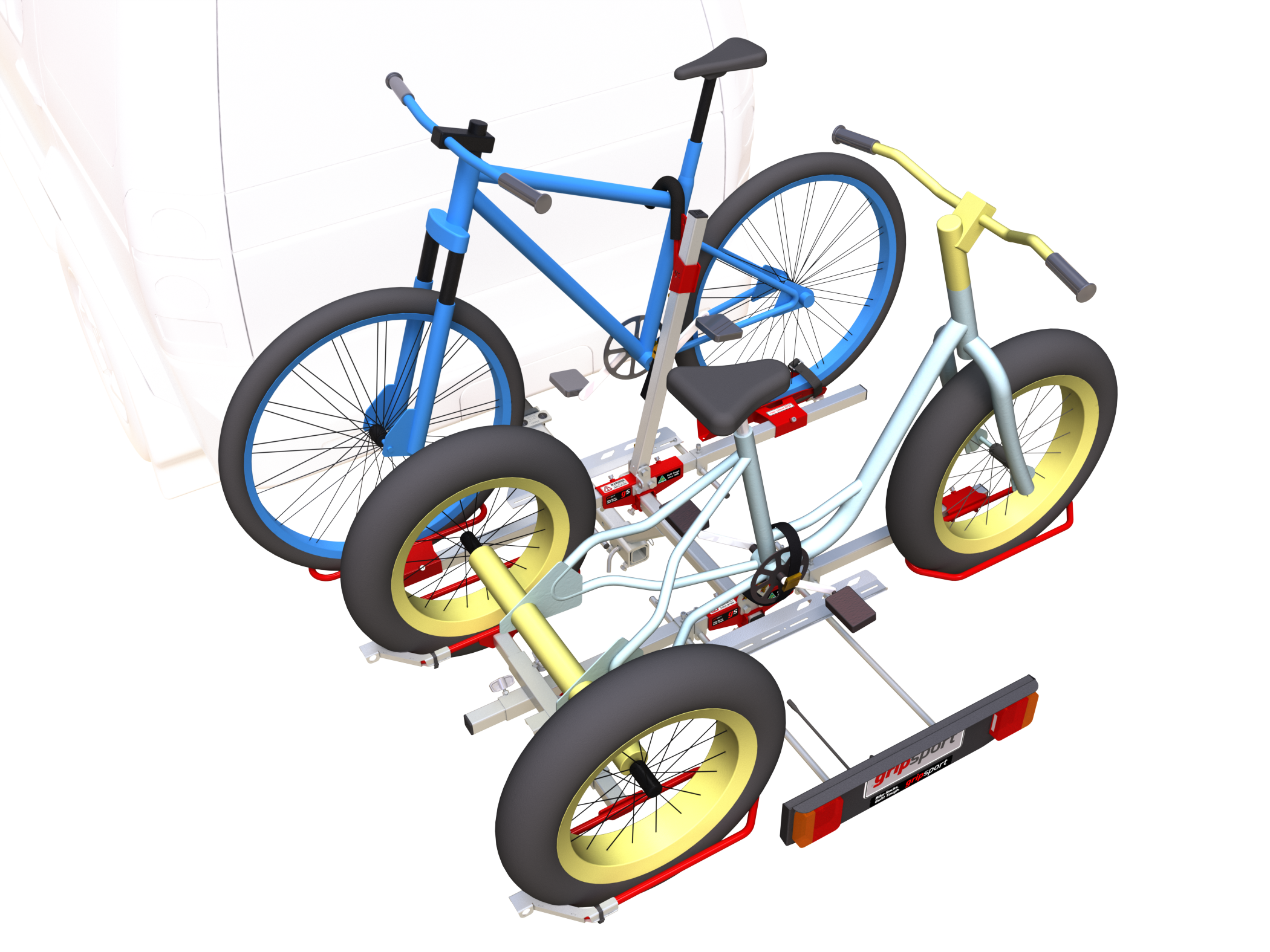 The GS-Trike+ Buddy + Ramps Hitch Mounted Bike Rack uses GripSport existing tech, design, and engineering, allowing you to safely and securely carry a trike or recumbent bike AS WELL AS another conventional bike or E-Bike at the same time.